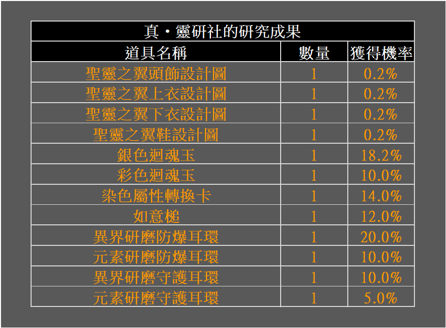 真‧靈研社的研究成果中將機率開出 ()聖靈之翼設計圖,取得的設計圖可用於合成出永久的聖靈之翼套裝